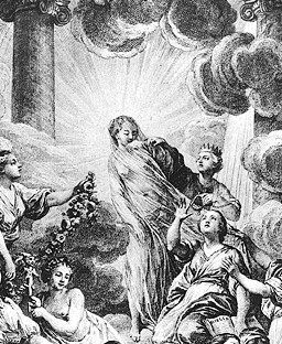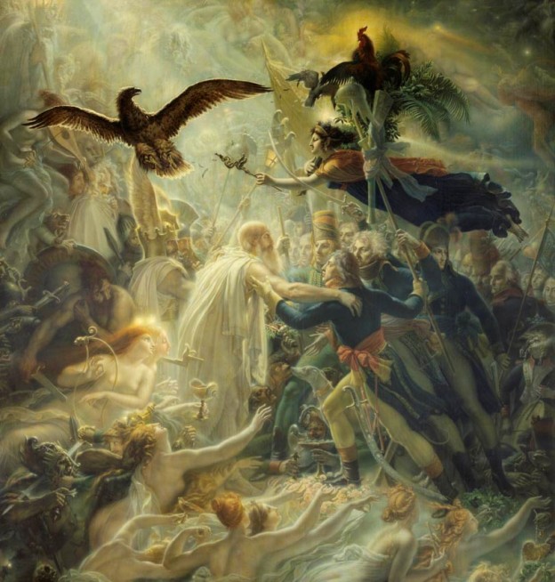 Girodet-Trioson, L’apothéose des héros français morts pour la patrie pendant la guerre de liberté, est une peinture très riche de sens. L’oeuvre représente l’Europe contre révolutionnaire repoussée par les guerriers français, Kleber, Marceau, Hoche, Desaix, reçus au royaume des braves par Ossian, barde légendaire de la mythologie celtique. En haut du tableau, on aperçoit l’aigle autrichien repoussé par le coq gaulois qui surplomb la scène. En bas, les barbares anglais battent en retraite. Deux figures allégoriques, une colombe et une femme, montent vers le ciel et la lumière, annonçant par là le régime de paix et de liberté.