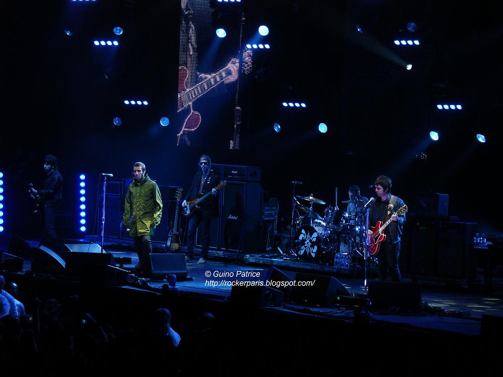 t des « liaaaammmmmmm »…lol un public d’étudiants mais aussi beaucoup de lycéens, le public d’Oasis s’est largement renouvellé depuis les deux derniers albums et ce n’est que tant mieux, ça fait plaisir de voir des mômes qui n’étaient pas né quand Définitely Maybe est sorti, s’éclater sur les hymnes du premier album. Au milieu de « To be where there is life« , un incident technique lié au son empêche le groupe de poursuivre le titre. Liam est hors de lui et sort des « fucking » non stop…loll Noel est là lui pour calmer les choses, l’ingénieur du son va en prendre pour son grade, le groupe quitte la scène quelques instants le temps que l’on règle les problèmes. Après 5mn le groupe revient et reprend le titre du départ. C’est ça que j’aime avec Oasis, il se passe toujours des choses lors des concerts :)) Liam quitte la scène et s’est au tour de Noel Gallagher d’entamer l’irrésistible titre du dernier album « Waiting for the rapture » avant d’enchaîner avec la sublime chanson « The Masterplan« , en acoustique pour cette dernière, un des moments magiques de ce concert à n’en pas douter. Les éclairages sont très beaux. Liam revient sur scène chanter « songbird« , puis débute l’une de mes chansons préférés d’Oasis « Slide Away« , la chanson démarre et la rebelote Liam s’époumone mais le micro ne répond plus, nouveau problème de son et cette fois-ci, grosse explication entre ce dernier, Noel et les ingénieurs du son. Ce n’est pas grave nous aurons le droit à « Slide Away » une seconde fois, que du bonheur. Sa voix est parfaite ce soir, il est en grande forme malgré ses deux incidents techniques qui ont émaillé le concert. Slide Away se termine sous un tonnerre d’applaudissement, suivent « Morning Glory« , « Ain’t Got Nothing« , la très belle « The Importance of Being Idle » chanté par un Noel très inspiré sur ce tire, enfin Liam chante « I’m Outta time« . Survient alors l’hymne d’Oasis par excellence « Wonderwall » qui rend Bercy chaud bouillant, les briquets s’allument de partout, tout le monde se lève et reprend en coeur les paroles du refrain « I said maybe You’re gonna be the one that saves me And after all You’re my wonderwall« . A peine le temps de me remettre de mes émotions que survient « Supersonic » qui déclenche un énorme mouvement de foule. Et Liam de faire monter une jeune fille sur scène. Cette seconde partie duconcert est vraiment brillante. « I need to be myself