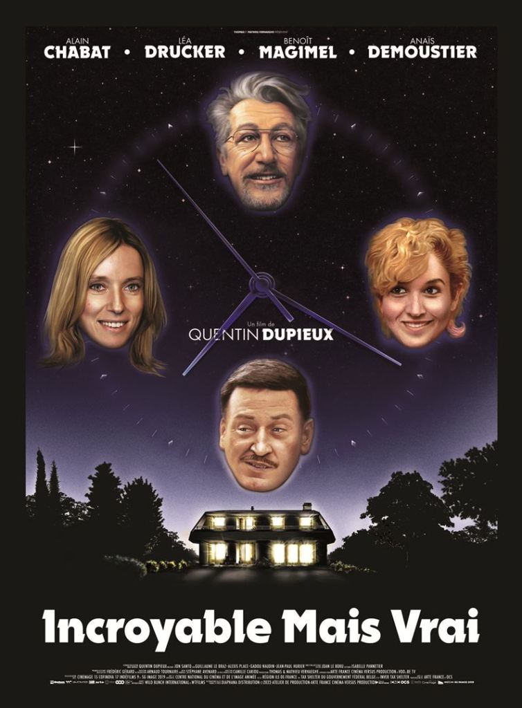 Mon avis : On ne présente plus Quentin Dupieux, le scénariste et réalisateur le plus barré du cinéma français . « Incroyable mais vrai » est sans doute son film le plus accessible. A la recherche d’une maison, le couple formé par Alain Chabat et Léa Drucker est intéressé par une résidence. L’agence immobilière envoie un vendeur. La maison est sans vraiment emballer le couple. L’agent leur parle d’un élément qui pourrait changer le cours de leur vie. Dans le sous-sol une trappe. Invité à y descendre, le couple s’interroge et fini par suivre l’agent immobilier. Ils descendent par la trappe, une échelle et se retrouve dans la même résidence que celle visité. Seule différence et pas des moindres, ils ont reculer de trois jours dans le temps. A chaque passage par la trappe, ils perdent trois jours. Léa Drucker trouve cela formidable, rajeunir n’est pas sans lui déplaire. La vie du couple s’en trouve totalement transformé. Ils ont un couple d’ami. Anaïs Demoustier qui joue la fiancée à l’intelligence limitée d’un Benoît Magimel formidable en Beauf de service. Il dure 1h10 mn mais c’est hilarant. Si vous aimez les films décalés, bien trippant, l’univers de Dupieux est fait pour vous. Je n’aime pas tous ses films mais celui-ci m’a beaucoup plu.