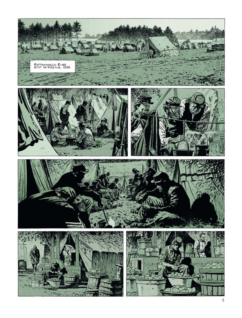 Ma chronique : Steve Cuzor signe le scénario et les dessins de la BD historique « Le combat d’Henry Fleming. » Une BD librement inspirée de l’un des romans fondateurs de la littérature moderne américaine « The Red badge of Courage« , écrit en 1894 par Stephen Crane. Un roman qui sera définit comme « L’une de nos meilleures œuvres littéraires » selon, ni plus ni moins, qu’Ernest Hemingway lui-même. Nous sommes au Printemps 1863, dans l’Etat de Virginie, sur les rives du Rappahannock, où 190 000 soldats américains s’affrontent durant la Guerre de Sécession (qui durera de 1861 à 1865). S’y opposent les Confédérés du Sud esclavagiste et les Unionistes du Nord industriel. L’année 1863, où se déroule les évènements contés dans la BD, constitue un tournant dans cette guerre. Les uniformes gris des Confédérés s’affrontent aux uniformes bleus des Unionistes. Henry Fleming a 18 ans lorsqu’il intègre les forces armées de l’Union. Steve Cuzor nous raconte l’envers de la guerre, faite d’escarmouches, d’assauts inconsidérés et mortels. La piétaille, la troupe, est mal considéré par les officiers et les généraux de l’état major. La troupe est perçu comme de la chair à canon, des paysans tout juste bons à succomber au front, pour de menus progrès sur le terrain. Le régiment d’Henry Fleming monte au front pour livrer bataille. Le quotidien de Fleming nous plonge dans cette guerre meurtrière (617 000 morts) faite d’escarmouches mais aussi de batailles rangées visant à faire charger la troupe, sous le feu de l’artillerie ennemie, pour déloger ces derniers de leurs positions. Henry Fleming n’a jamais connu le feu. Il monte à l’assaut la boule au ventre (comment pourrait-il en être autrement ?), surtout il se pose la question de savoir s’il a assez de cran ou plutôt ce grain de folie, pour prendre part à l’assaut. La frontière est mince entre le déserteur et le héros. En quelques jours, se jouent les premiers affrontements et se perdent les dernières illusions sur la réalité de la guerre. Les illustrations sont particulièrement réussies. Le choix de montrer les affrontements, au plus près de la réalité des combats, est très judicieux. On est au cœur de la bataille et l’on vit l’avant, le pendant et l’après de celle-ci. Les couleurs donnent un aspect brumeux aux combats, avec la fumée liée aux tirs de l’artillerie et des fusils. C’est dans ce nuage de brouillard que doivent se repérer les soldats. Henry Fleming va changer et, ce pour toute son existence, durant les combats auxquels il participe. Il ne sera plus jamais le même suite à cela. Il y aura un avant et un après. Paru chez l’éditeur AIRE LIBRE, « Le combat d’Henry Fleming » est l’une des toutes meilleures BD historique de ce premier trimestre 2024. J’ai aimé le côté réaliste de la description des conditions de vie des soldats, mais aussi des charges au cours de la bataille. Le sang, les blessures, l’atrocité des combats, l’ineptie des stratégies et des sacrifices demandés à la troupe pour prendre une position aussitôt abandonnée. C’est, à mon sens, une très belle BD historique avec un message fort. Le contexte, le fait de situer l’intrigue durant ce qui fût l’une des premières grandes boucheries des guerres à l’échelle industrielle, tout ceci concoure à rendre cette BD indispensable pour qui aime ce genre. C’est un gros coup de cœur.