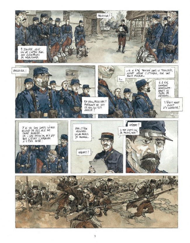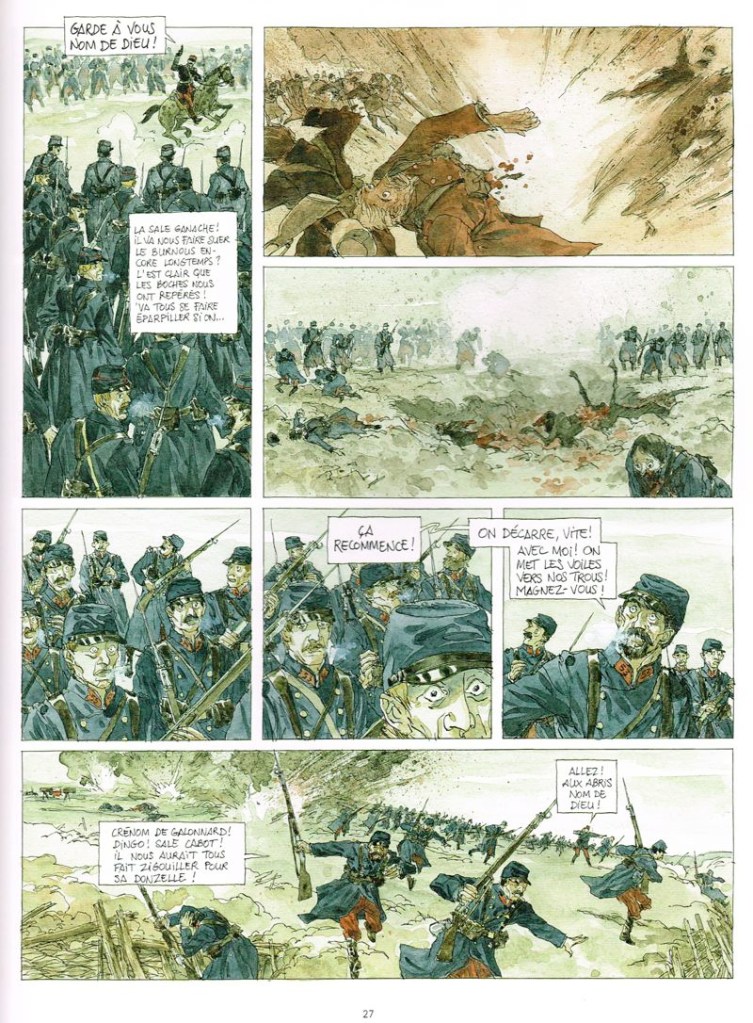 Pour le synopsis, on y retrouve un lieutenant gendarme chargé d’enquêter sur la mort de plusieurs femmes assassinées près du front. Leurs corps sont tous retrouvés avec une lettre d’adieu écrite par le meurtrier et cachetée par la boue des tranchées. De 1915 à 1918, nous allons suivre l’avancée de cette enquête qui piétine tant les indices sont minces. C’est l’occasion pour l’auteur Kris de nous montrer l’horreur des tranchées et le sort réservé aux masses paysannes servant de chair à canon à des officiers peu regardant sur les pertes. Les dialogues et les descriptions du récit des combats sont très bien écrits. On a presque l’impression de lire un roman. Mais la réussite vient aussi des illustrations qui sont splendides et très réalistes. Maël réalise un tour de force en nous immergeant au plus près des combats. Chaque illustration fourmille de détails. Des décors apocalyptiques. Cela renforce l’immersion dans ces tranchées, au cœur de cette guerre atroce. L’enquête sur ces assassinats est passionnante et il est difficile de décrocher avant d’en connaître la fin. Merveilleusement illustré, le tout avec un récit solide qui nous plonge dans le quotidien de ces poilus sacrifiés par des généraux prônant l’offensive à tout-va sans se soucier des pertes. La psychologie de ces poilus est travaillée et très réaliste. J’en veux pour preuve la préface signée par Nicolas Offenstadt qui souligne cet aspect des choses, lui qui est un des plus grands historiens français de la Grande Guerre.