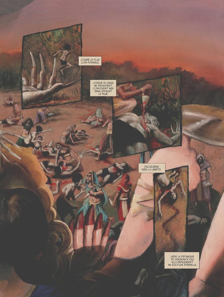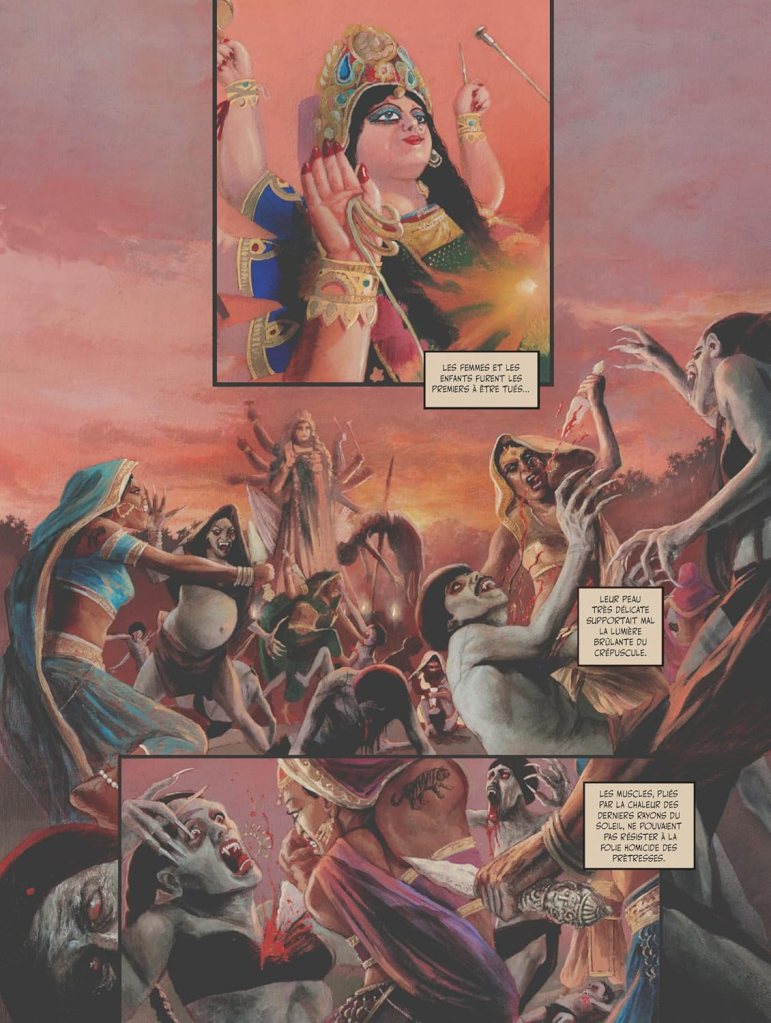 « Kundan » est une trilogie parue en 2025 chez Glénat BD. Elle est signée de la scénariste italienne Luana Vergari et du dessinateur et coloriste Emmanuel Civiello. Ce qui est frappant dans cette BD, c’est la qualité des illustrations qui sont absolument sublimes et très cinématographiques dans leur rendu. Les illustrations sont le point fort de ce premier tome « Le temps du sang ». Cette couverture mystérieuse et lugubre rappelle les affiches des films de la Hammer, célèbres pour leurs longs-métrages de vampires. C’est ce qui m’a attiré et convaincu de l’acheter. Nous sommes en Inde, au début du XXe siècle, et les prêtresses de la déesse Durga annihilent les créatures maléfiques que sont les vampires. Tous sont massacrés sauf un enfant qui échappe miraculeusement à ce sort funeste. Le récit nous emmène ensuite en 1910 à Londres. On retrouve dans une ruelle un garçon des rues mort. Mais le plus troublant, c’est que son corps a été entièrement vidé de son sang. Bientôt, il y a une seconde victime, puis une troisième… Le mode opératoire est toujours le même et les victimes entièrement vidées de leur sang. Lord Benedict est chargé de l’enquête puisqu’il dirige la brigade de nuit. On lui donne comme adjoint un certain Kundan. Un homme mystérieux au regard qui vous transperce. Kundan a un pouvoir maléfique parmi d’autres, il peut prendre les traits de ses victimes. Bientôt, une révolte secoue l’Inde. Lord Benedict est envoyé là-bas, car c’est celui en qui le roi a le plus confiance. Benedict fait appel à Kundan pour l’accompagner en Inde. Kundan va retrouver sa terre natale et ses désirs de vengeance. C’est addictif sur le plan du scénario et les illustrations font le reste, car elles sont puissamment évocatrices et installent le malaise dans certaines situations. Pour celles-ci, j’ai songé aux dessins d’Emil Ferris. « Kundan » ferait, à coup sûr, un excellent film de cinéma s’il était adapté. Je vais poursuivre cette saga avec les tomes 2 et 3 qui sont parus, eux aussi, en 2025. Si vous aimez les BD horrifiques avec des vampires et autres créatures de la nuit, alors cette BD est faite pour vous. Je vous la recommande.