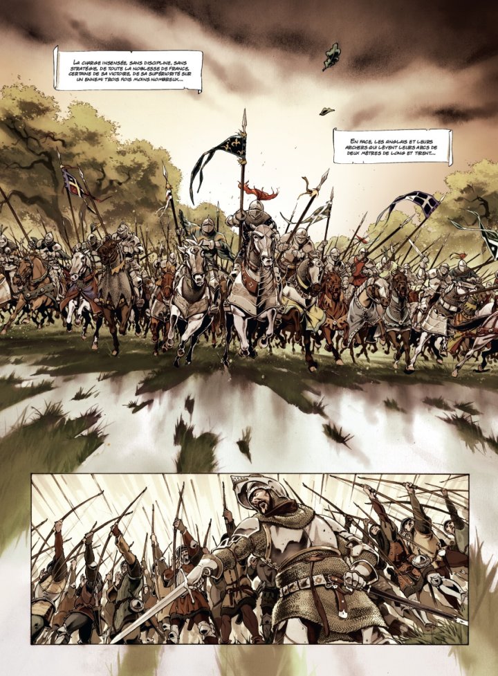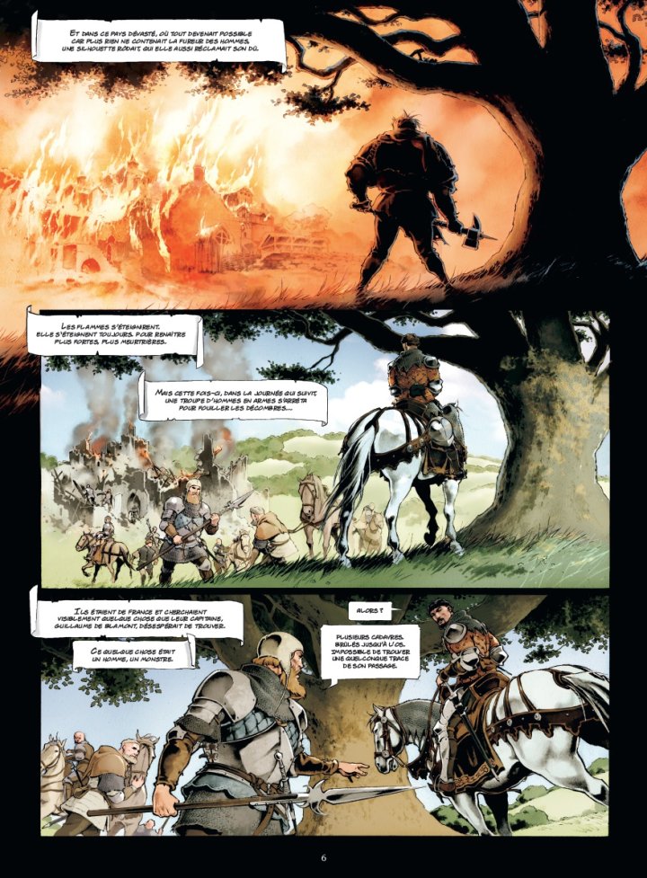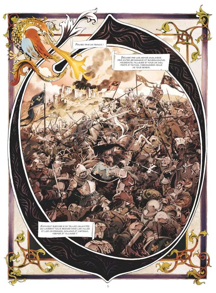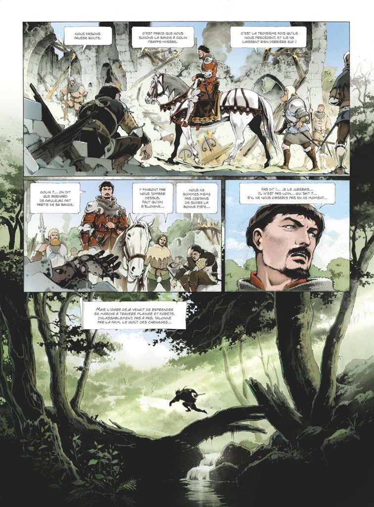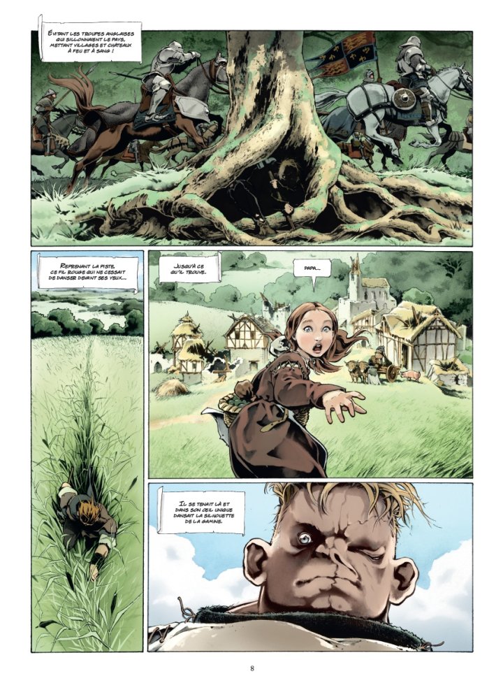 Nous sommes en 1427, en pleine guerre de Cent Ans opposant l’Angleterre et le royaume de France. Pour les Anglais, la conquête du pays de France est un objectif qui semble n’avoir jamais été aussi possible qu’en ces sombres années. La France est en pleine guerre civile entre d’un côté les Armagnacs, partisan du futur roi de France Charles VII et de l’autre les Bourguignons qui sont les fidèles alliés du roi d’Angleterre. Pendant ce temps, le dauphin Charles VII s’est réfugié à Chinon où il tente vainement de reprendre l’initiative. Mais bientôt, du plus profond des ténèbres surgira Jeanne d’Arc. À l’heure où les grandes compagnies, composées de soldats déserteurs et de brigands de tout horizon, sèment la panique, un ogre multiplie les assassinats sur des personnes de tout sexe et de tout âge. Cet ogre est recherché. Son aspect est disgracieux au possible et suffit à effrayer les gens. Habitué à être repoussé de tous, il vit de rapine et de la chasse. Une violence endémique, un conflit guerrier qui s’éternise, il n’en faut pas plus pour en faire une fresque pleine de bruits et de fureur. Car l’ogre va rencontrer celle que l’on appelle la pucelle, Jeanne. Je ne vous en dis pas davantage pour ne pas retirer toute la saveur de la découverte. Jean Dufaux a écrit le scénario, lui qui est aussi très connu pour la saga « Murena », que j’apprécie tout particulièrement. Un scénario qui multiplie les scènes d’action avec des batailles et la mort qui rôde partout. Ce n’est pas dans ce tome que Jeanne rencontrera, Charles VII, mais dans le futur Acte II. Mais que serait un scénario, aussi habile soit-il, sans un dessinateur de grande qualité comme Juan Luis Landa. J’ai beaucoup aimé les planches d’illustrations. Les représentations des corps et des visages, leur expressivité et puis les scènes de batailles qui tournent à la catastrophe pour les Français. C’est la rencontre de Jeanne qui va entraîner l’ogre sur un autre versant. La psychologie des différents personnages est intéressante et le contexte historique passionnant. Jean Dufaux mêle personnages de fiction et personnages ayant réellement existé. C’est une ébauche et je pense que l’on rentrera pleinement dans le vif du sujet avec l’Acte II. C’est une très belle BD mêlant histoire et thriller. Comment cet assassin de la pire espèce qu’est l’ogre, meurtriers d’enfants monstrueux va t’il pouvoir retrouver le chemin de la rédemption ? Un récit politique également avec les alliances qui se font et se défont dans une France à feu et à sang. En attendant l’Acte II, je vous recommande cette BD parue chez Glénat et qui s’appelle « L’Ogre Acte I ».
